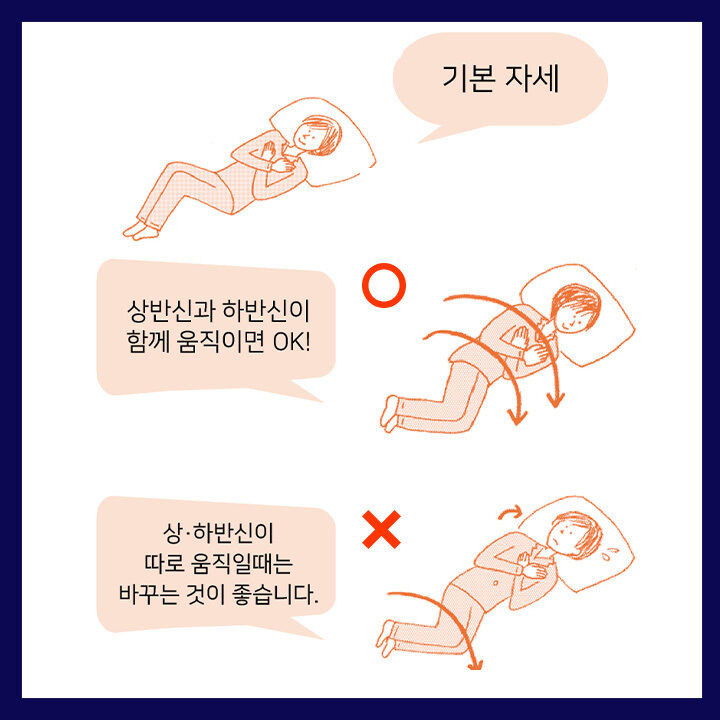 기본 자세를 취한 후, 좌우로 몸을 뒤척이는 동작을 할 때 상반신과 하반신이 하나가 되어 움직인다면 자신의 몸에 맞는 매트리스와 베개를 사용하고 있는 것입니다.